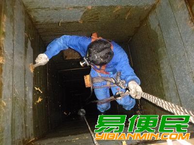 此法主要用于清洗50公分见方以上的竖烟道,技术人员先拆下管道的上截和下截,在烟道上方固定高空安全绳,系上安全带,技术人员从上至下清洗竖烟道内的油污。此法危险性较大,技术性强,费用较高,清理效果好。由于竖烟道一般积油较少一年清洗一次即可。